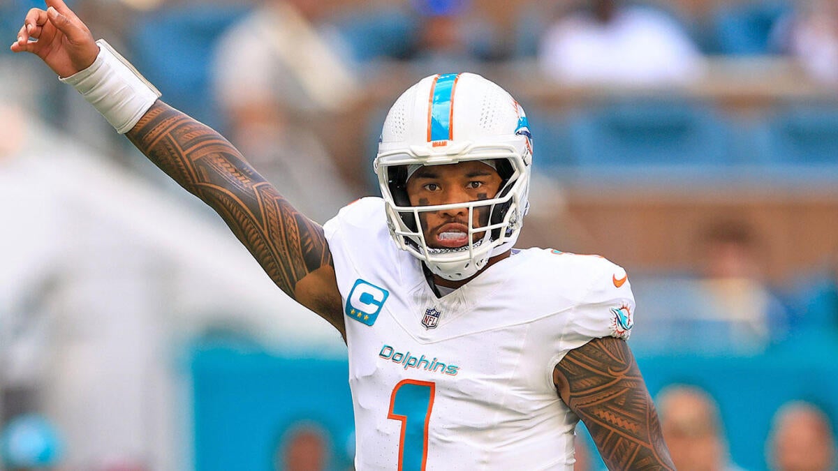 বিয়ার্সের সাথে যৌথ অনুশীলনের সময় তুয়া তাগোভাইলোয়া লড়াই করে, 2021 সাল থেকে প্রিসন ওপেনারে প্রথম স্ন্যাপ গ্রহণ করে